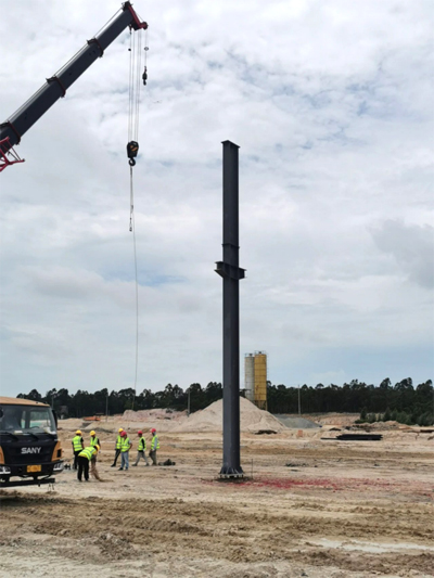 2020年8月16日11:16,经过为期两个月的基础开挖,基坑换填,承台施工,墩柱施工,钢构预埋,广西新福兴硅科技产业园联合车间第一根钢柱立起来了!