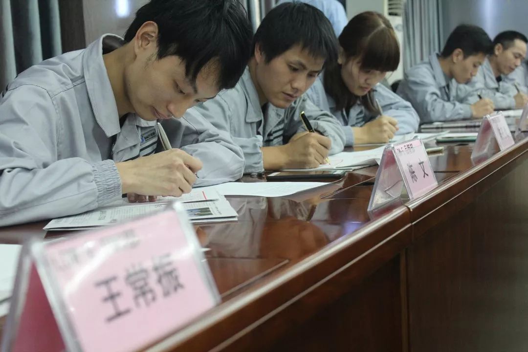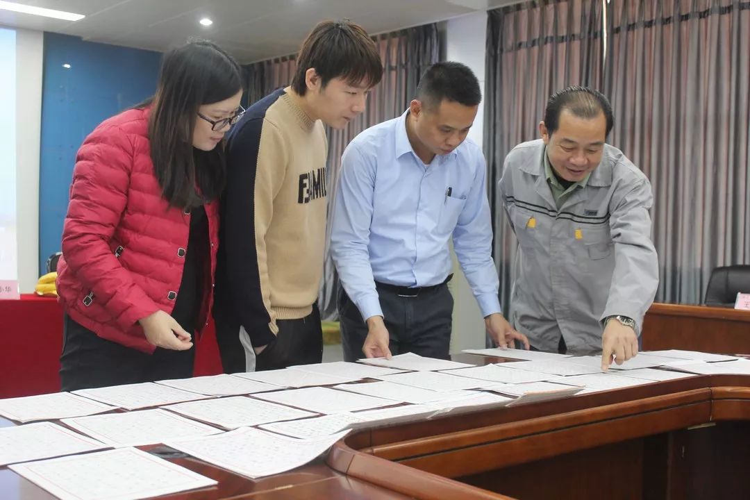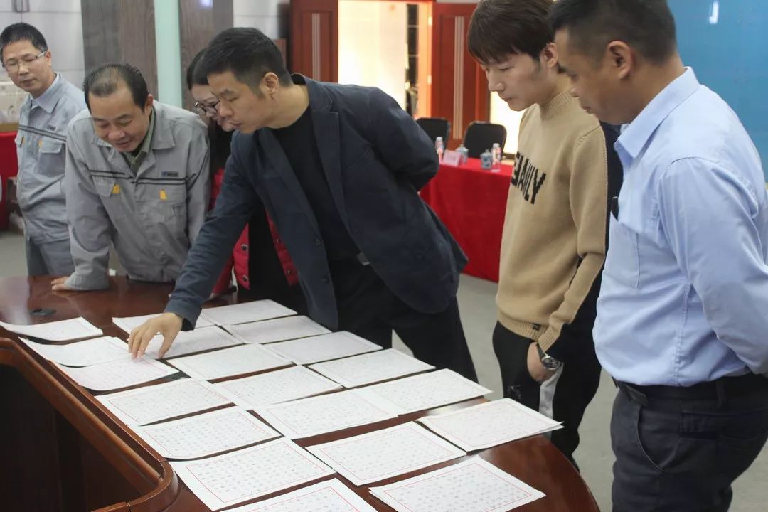 经过第一轮的热身赛,共有16名选手顺利进入决赛。决赛现场既紧张又令人期待。在沙沙沙的书写声中,一份份或饱满或清秀或飘逸的钢笔字书法作品逐一呈现。评委们本着公平公正、认真负责的态度,对作品逐字逐句的斟酌、探讨、分析、点评,两位副总甚至用上了手机放大镜。在激烈的角逐及投票表决之后,第四届获奖作品终于诞生了。获得第一名的是来自江阴公司的张学禄,凭借20多年的练字功底艳压全场,陈总裁评价其作品为雕刻的艺术品;第二名是来自福清公司的郑雅芳、林青峰,两人虽为90后,但对书写的把控十分到位,自成风格;第三名是来自福清公司的周平、莫全波、陈长辉,三位帅气的小伙子用实力向我们展示腹有诗书气自华;优秀奖依然是来自福清公司的陈桂义、赵文博、肖怀祥、陈森钦、梁旺明。